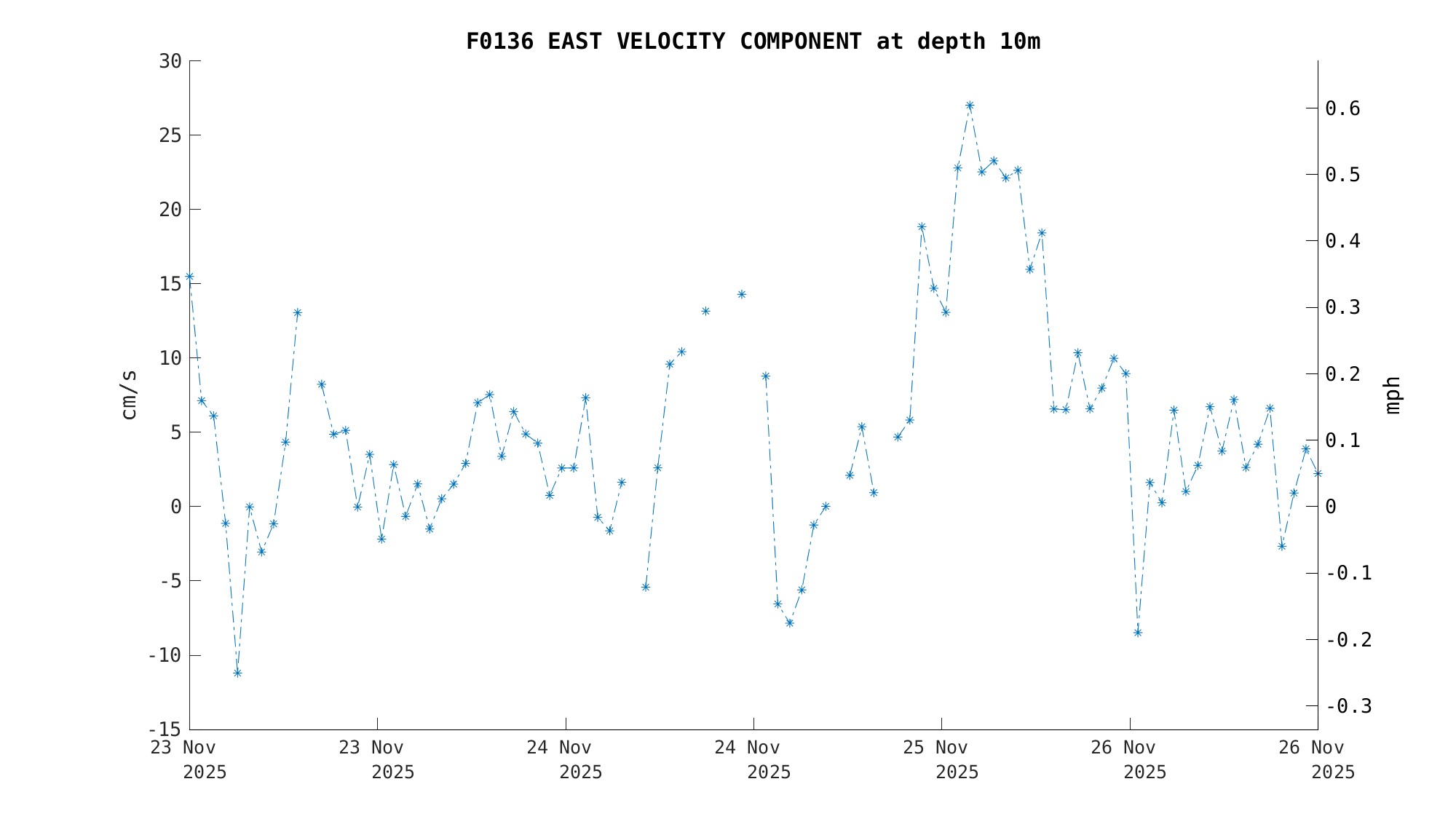 | East Current Velocity (2m) | -10.1 cm/s (-0.20 kts) | Nov 26 4:00 AM |