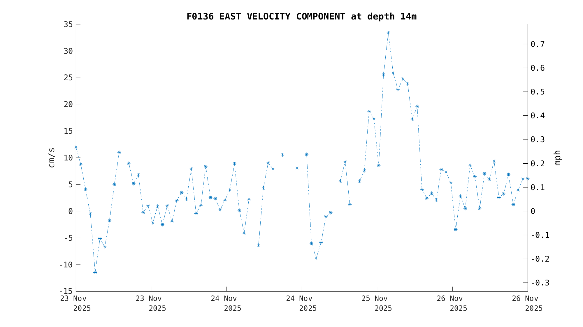 | East Current Velocity (14m) | 0.5 cm/s (0.01 kts) | Nov 26 4:00 AM |
