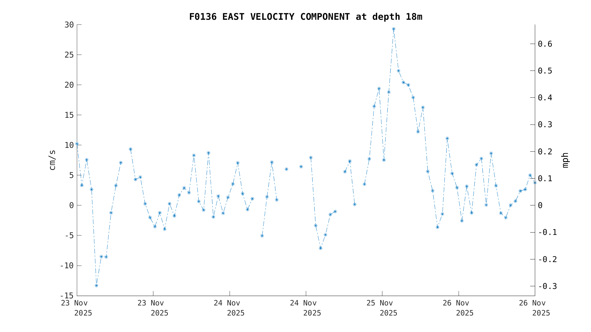 | East Current Velocity (18m) | -1.2 cm/s (-0.02 kts) | Nov 26 4:00 AM |