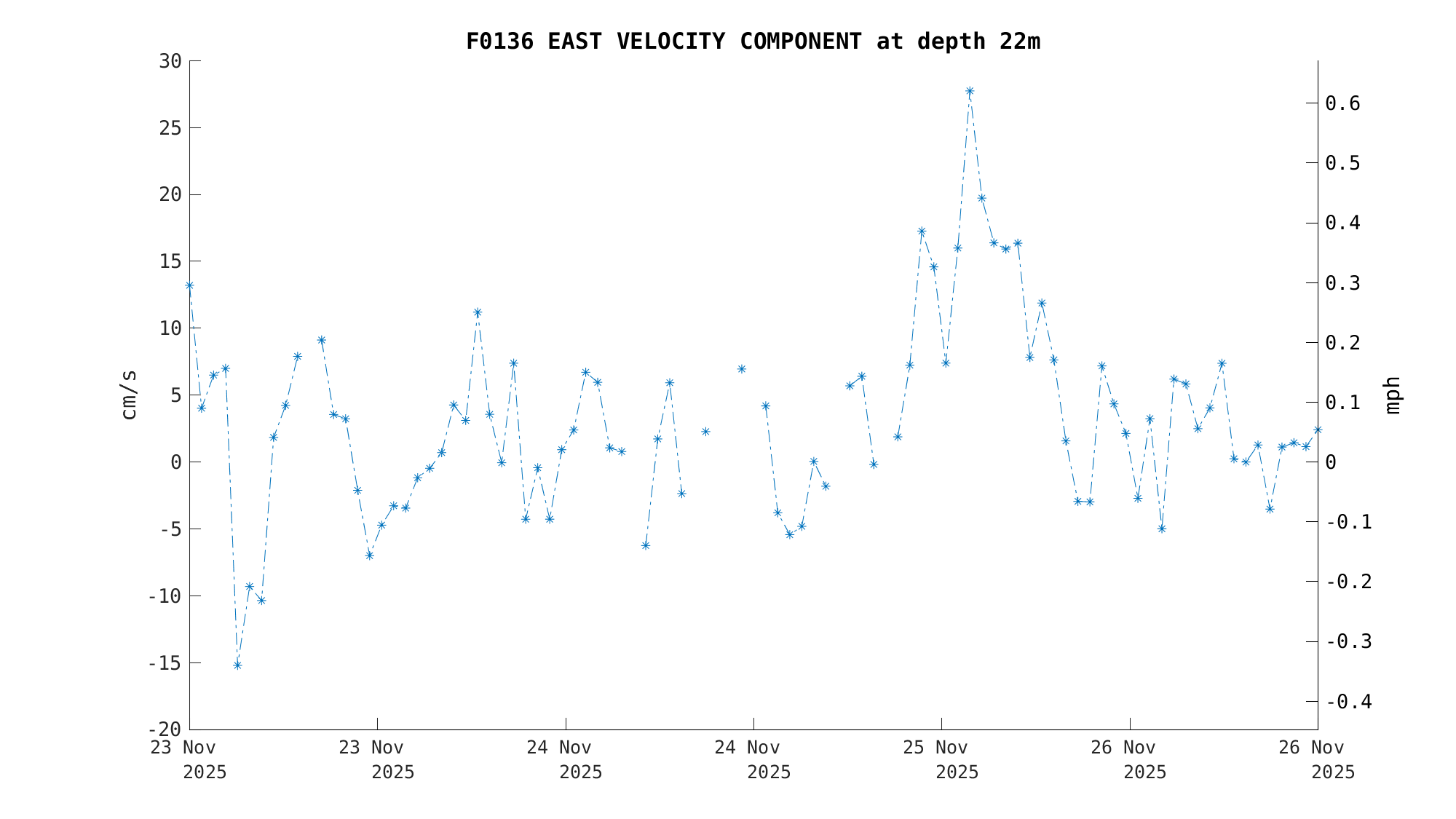 | East Current Velocity (22m) | -5.0 cm/s (-0.10 kts) | Nov 26 4:00 AM |