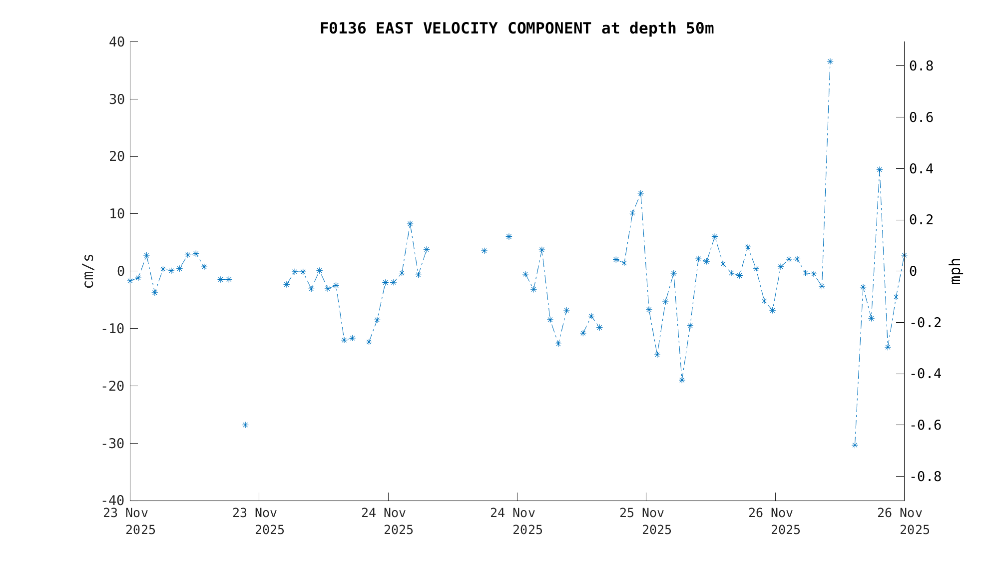 | East Current Velocity (50m) | 2.1 cm/s (0.04 kts) | Nov 26 4:00 AM |