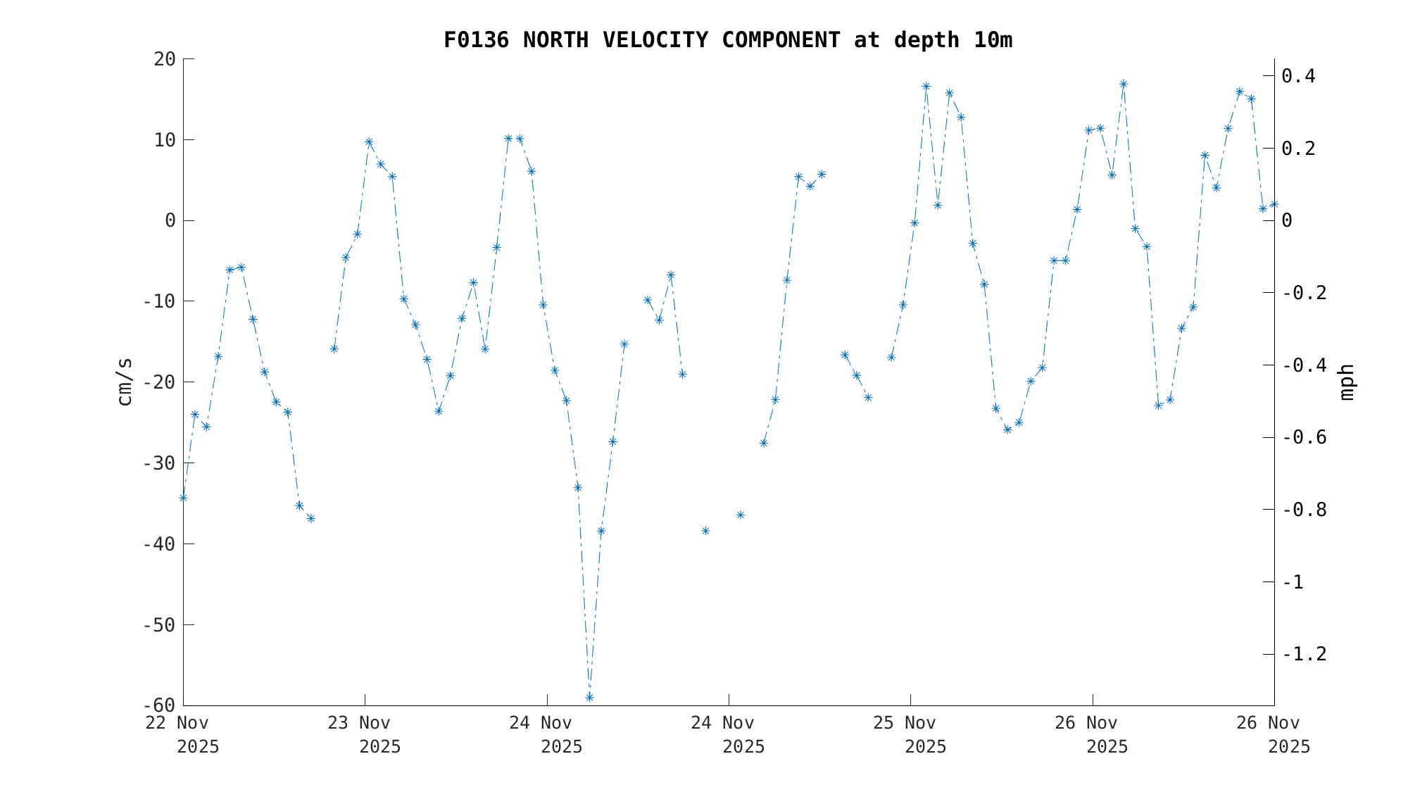 | North Current Velocity (10m) | -3.2 cm/s (-0.06 kts) | Nov 26 4:00 AM |