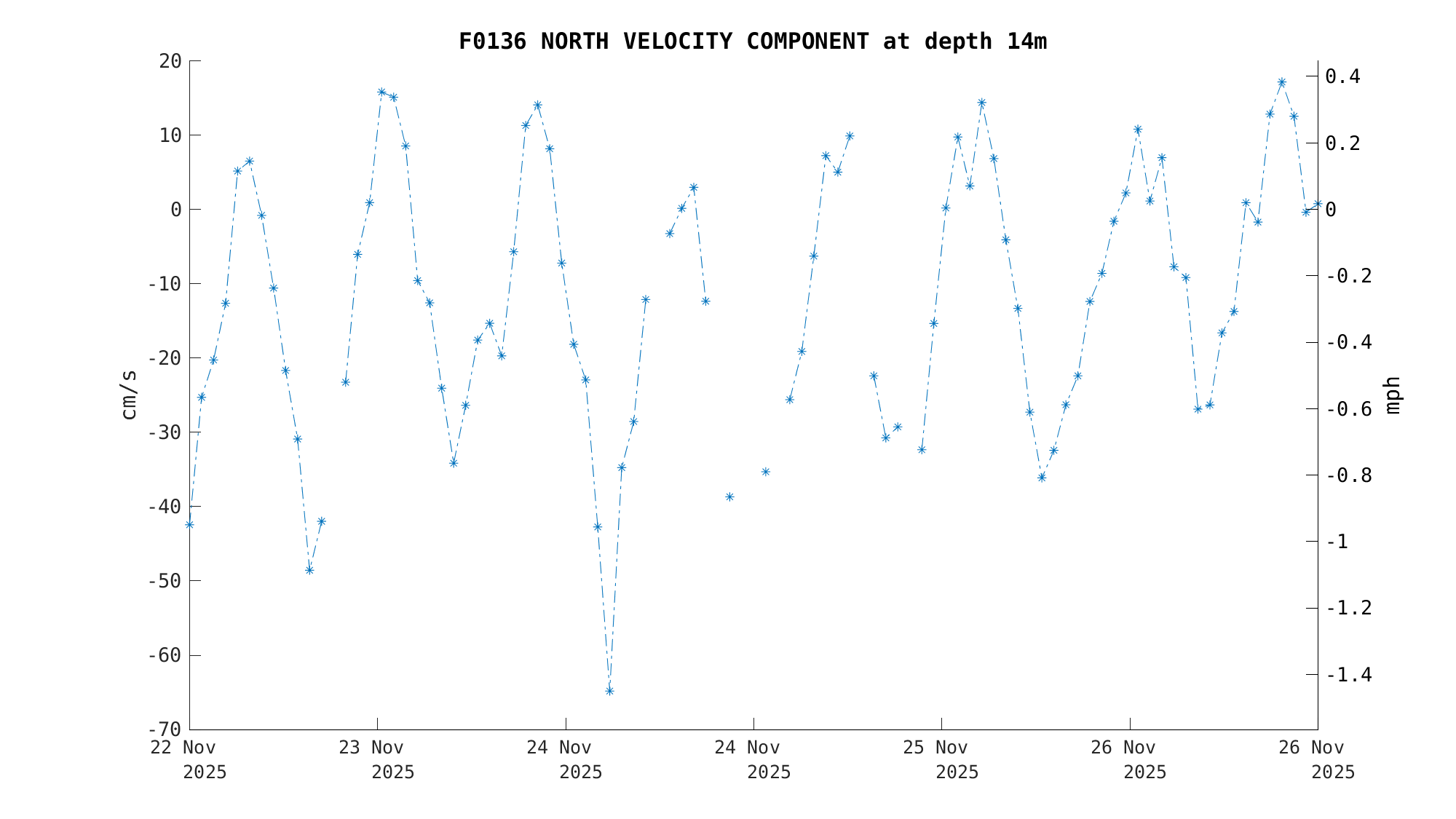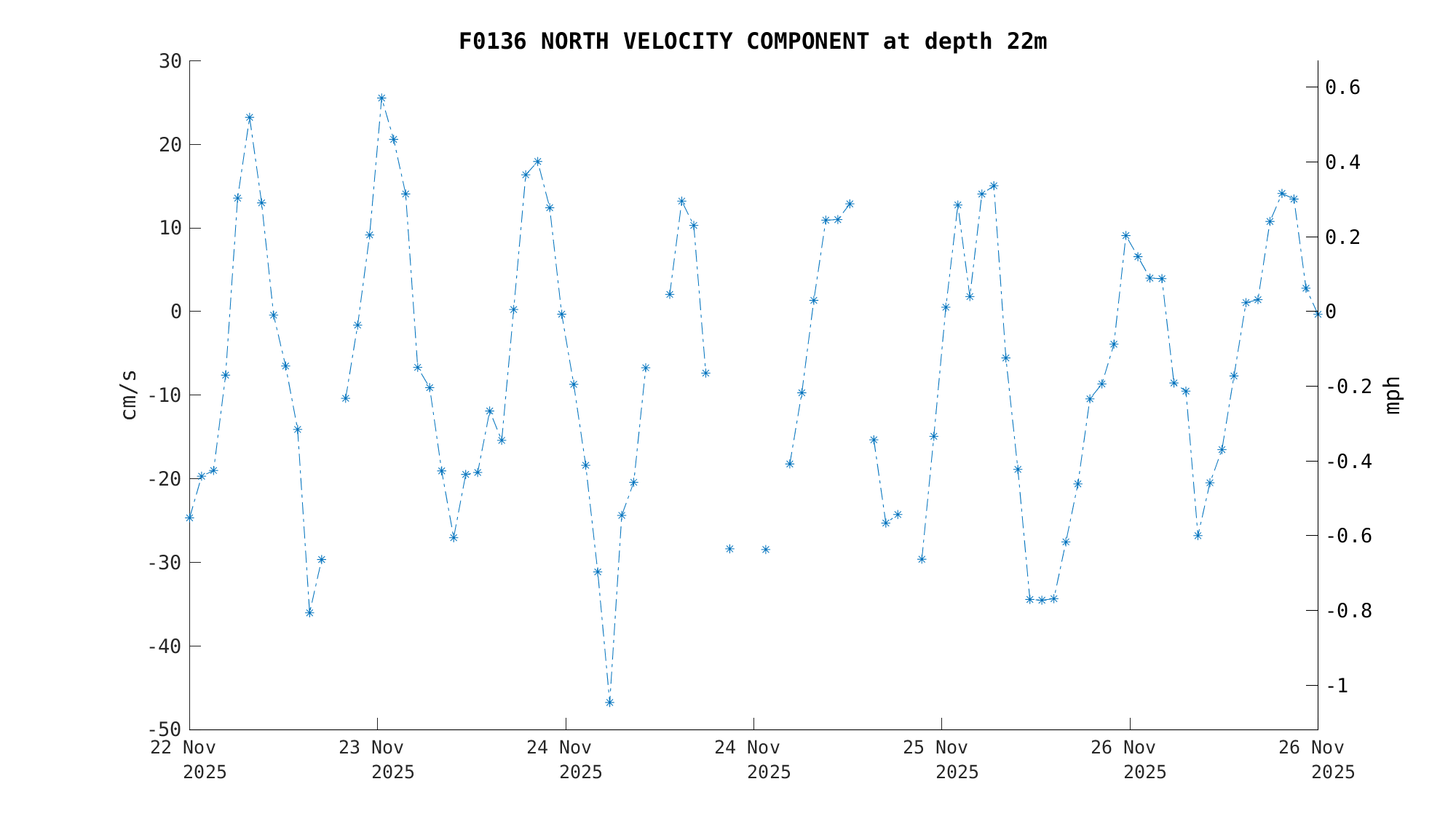 | North Current Velocity (22m) | -9.5 cm/s (-0.19 kts) | Nov 26 4:00 AM |