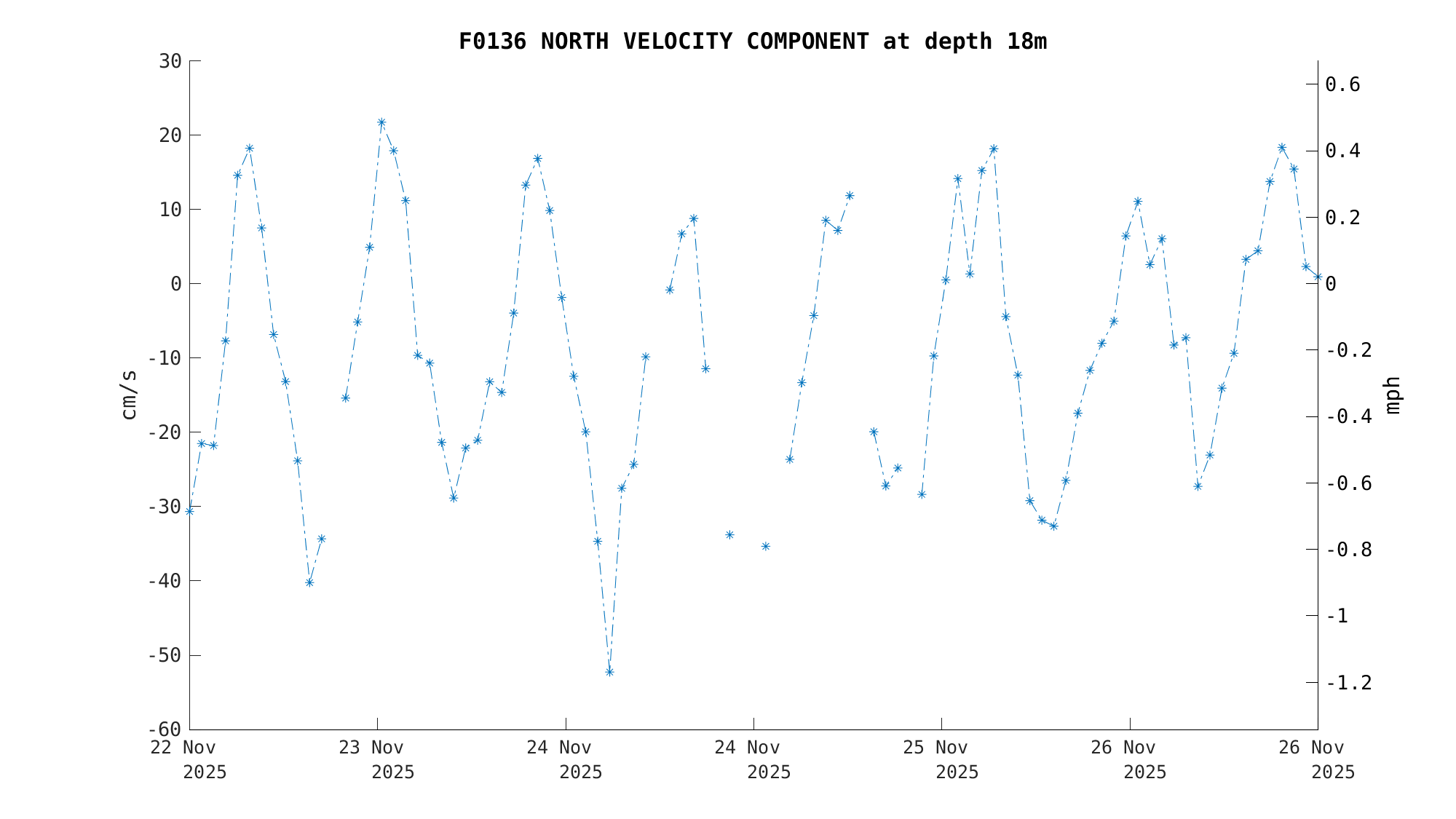| North Current Velocity (18m) | -7.3 cm/s (-0.14 kts) | Nov 26 4:00 AM |